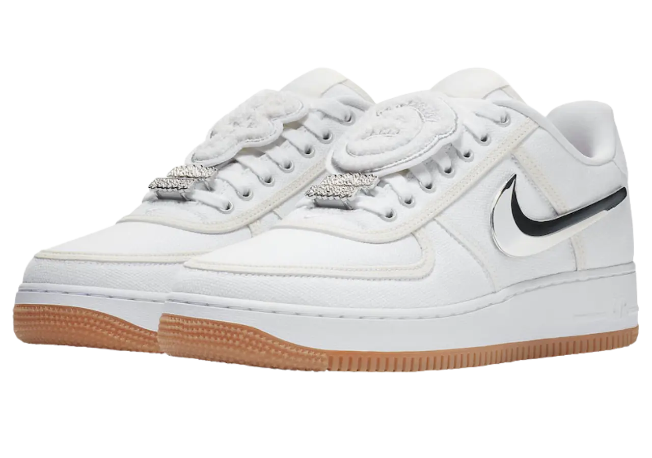 The Nike Air Force 1 Low Travis Scott AF100 is a special release of the Air Force 1 released in collaboration with rapper Travis Scott as part of the AF100 collection celebrating 35 years of the silhouette. The shoe features a predominantly white color scheme with a canvas upper and gum rubber outsole. It also bears unique details such as a detachable Swoosh that comes in different colors including silver, a Velcro stash pocket on the inside of the tongue, and an inverted Nike Air logo